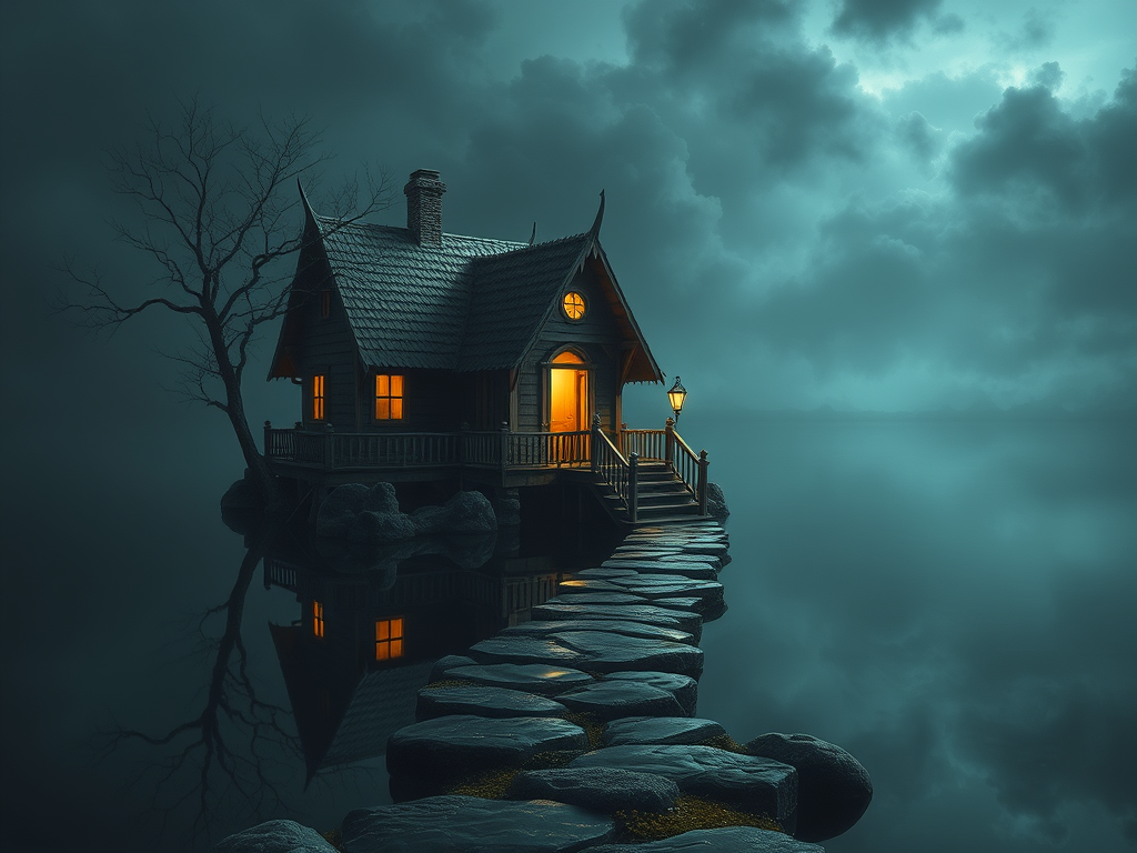 Inside was a cottage that floated atop a still lake that reflected the dark skies. A small stone pathway atop the waters paved her way towards the entrance to the cottage door. Before she could knock the second door, a young lady with the palest skin and the most entrancing beauty stepped out.